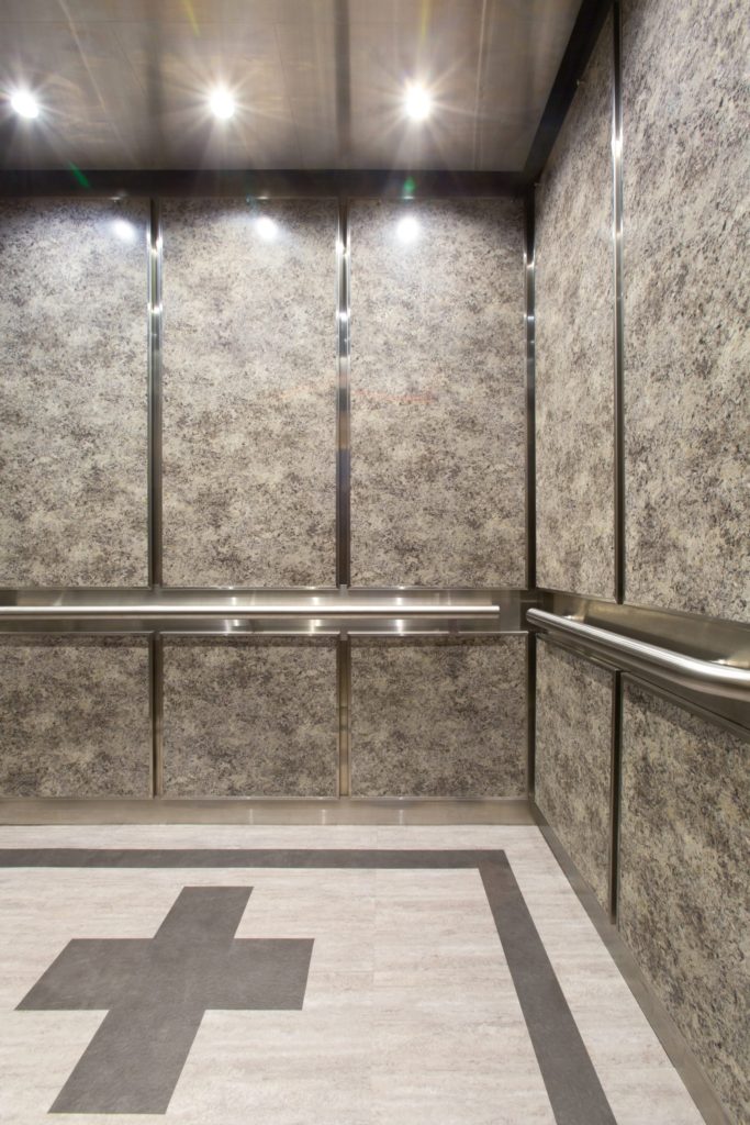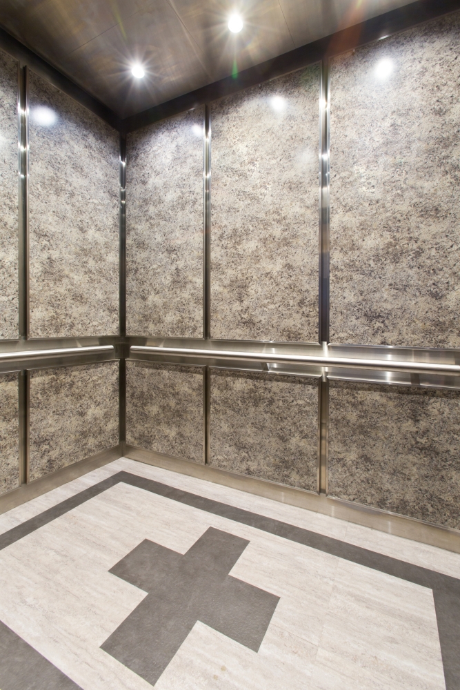 The North Quincy Street elevator cab interiors have a upper and lower wall panel design. Its upper and lower wall panels consist of plastic laminate. Each elevator wall panel is wrapped in a satin stainless steel panel binder. The reveals and island style ceiling are satin stainless steel. LED lighting is integrated into the elevator ceiling and designed specifically for elevator cab interiors. The flooring is two toned luxury vinyl tile. This type of flooring is excellent in elevator cabs due to its resilience to high foot traffic.
