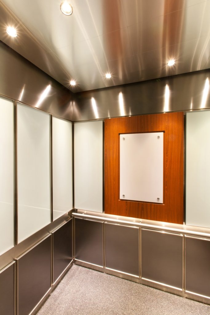 The Braddock Place elevator interior renovation project used an upper/lower wall panel design. This elevator interior is unique with respect to the center rear wall panel. The center wall panel is wood veneer with a built in bulletin board. The remaining upper wall panels are laminated back painted glass. All panels have protective satin stainless steel panel binders. The lower wall panels are a selection of plastic laminate. Reveals in this elevator interior are satin stainless steel. The island style ceiling has integrated LED down lighting. The handrail on the rear wall is satin stainless steel. This elevator cab interior has a unique modern look that will catch the eye of any passenger.