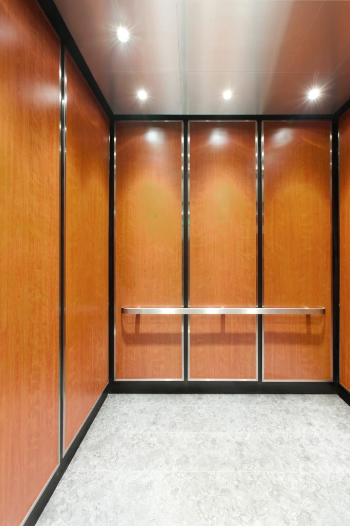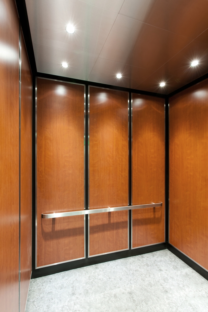200 Towson Town Blvd. elevator cab interiors feature a Vertical Wall Panel layout. This elevator cab has a satin stainless steel ceiling an incorporates eight LED down lights to properly illuminate the elevator cab. The reveals in this cab are black plastic laminate. Elevator cab interior wall panels are a wood grain plastic laminate with satin stainless steel panel binders wrapping the edges of each panel. Wall panel binders offer superior protection to the edges of panels, preventing cracking and chipping from daily use. The handrails are satin stainless steel flat bar with bent returns which curve inward towards the panels at either end. Flooring for this elevator is a stone pattern vinyl tile. The finishes inside this elevator cab interior give is a simple look and a professional feel.
