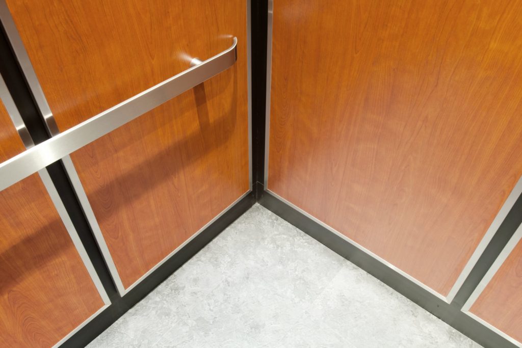 The photo to the right depicts a corner shot where the rear and side walls meet the floor. This elevator cab interior renovation included luxury vinyl tile flooring in a stone pattern. You can also see the wall panel binders complement the wall panel laminate nicely allowing each panel to stand out from the rest of the cab.