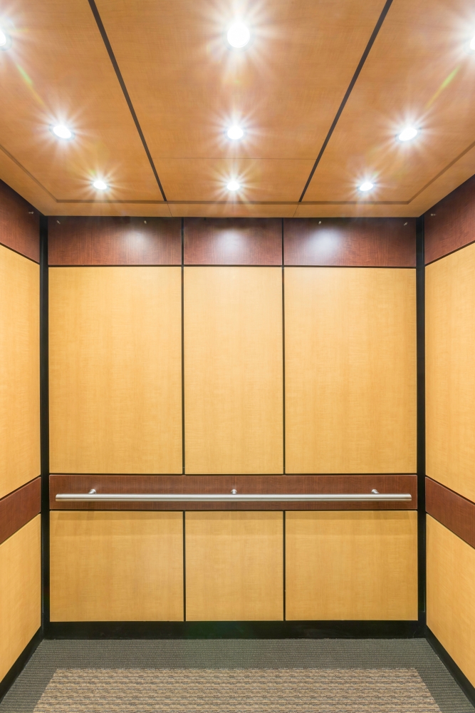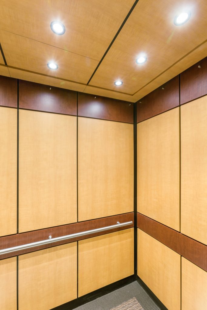 This elevator interior remodel is a complete renovation of interior cab finishes. The ceiling and elevator interior wall panels are fabricated from matching wood grain plastic laminate. The ceiling has integrated LED lighting designed specifically for elevator cab interiors. Reveals in this cab were fabricated from black plastic laminate. The handrail is round and made from satin stainless steel and the flooring is carpet. The accent frieze and chair rail wall panels are fabricated from a darker wood grain plastic laminate. Contrast in plastic laminate selections gives this elevator cab structure and symmetry.