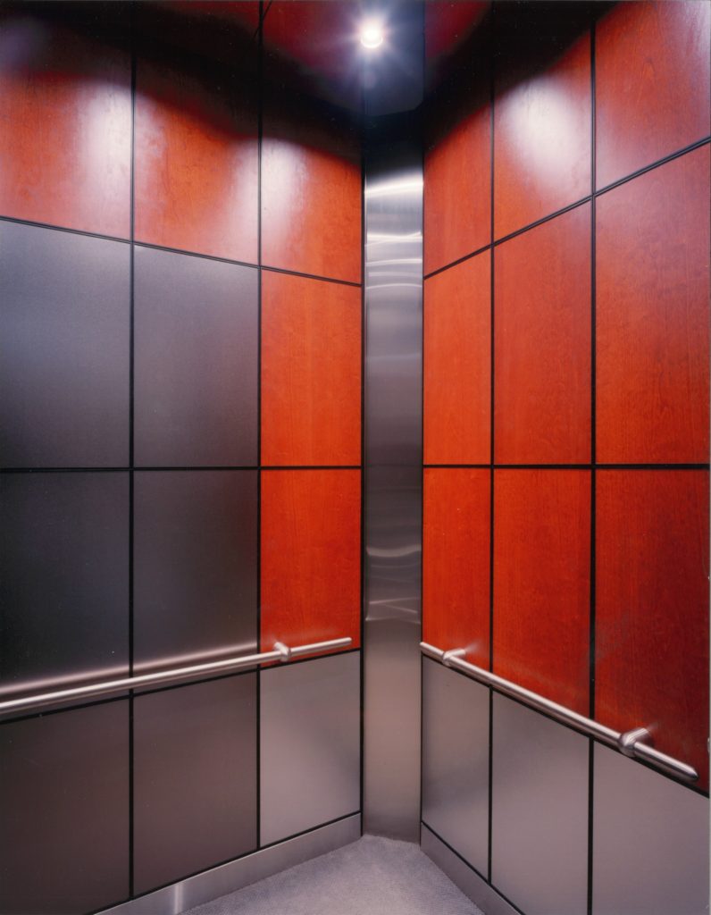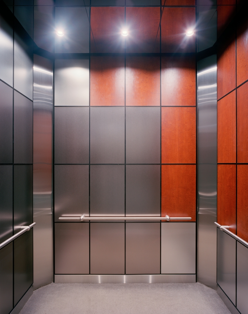 The American Postal Workers Building elevator interior features a grid style layout. The wall panels are a mix of plastic laminate and textured metal. The corners of the elevator cab interior feature large reveals set at a 45 degree angle. The island style ceiling is mirror polished stainless steel with integrated LED down lighting. Vaulted style satin stainless steel handrails were installed on each wall of the elevator cab. This cabs elevator interior has a custom eye catching look.