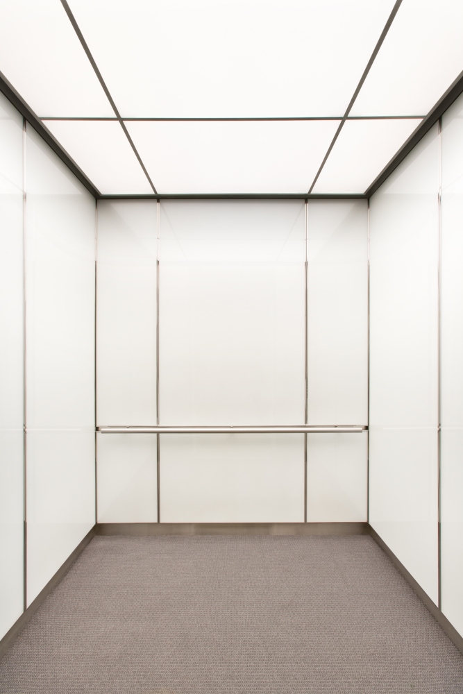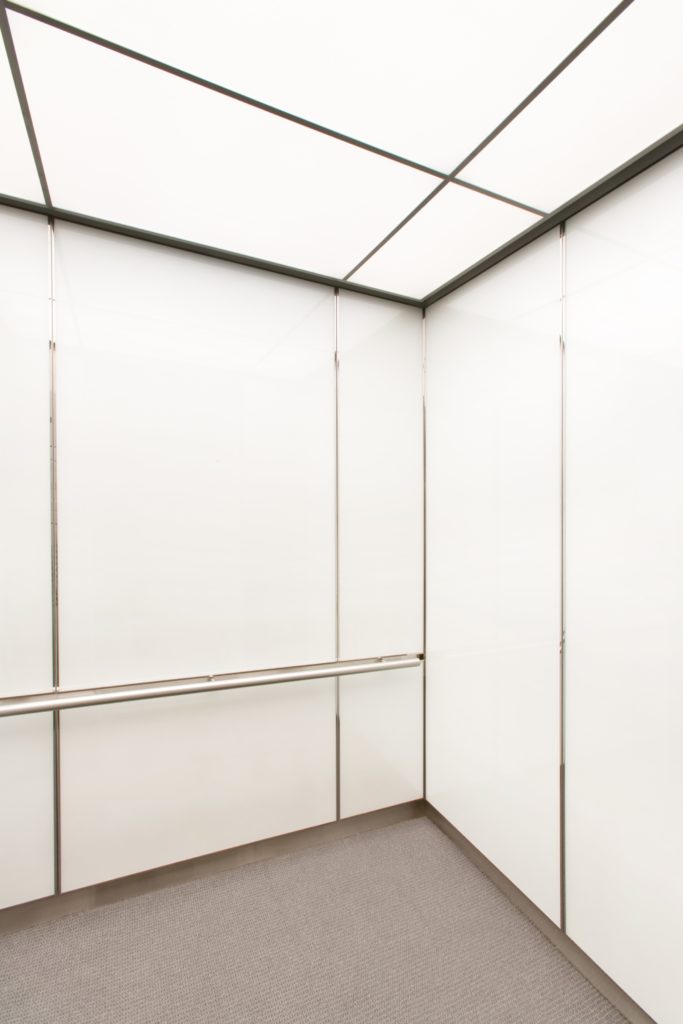 This elevator cab interior is clad in satin stainless steel. Our elevator interior renovation consisted of the installation of new ceiling, lighting, reveals, handrail and wall panels. The grid style ceiling incorporates satin aluminum frame grid and translucent poly-carbonate light diffusers. Elevator lighting is attached to the cab dome and diffused through the grid ceiling to dispense the light evenly across the entire cab. Reveals in this elevator cab interior are satin stainless steel. The handrail is round with bullet ends and is made of satin stainless steel. The elevator interior wall panels are made out of white back painted laminated glass and wrapped in a stainless steel panel binder. This combination of materials give the elevator cab interior a stylish futuristic look. Stainless steel wall panel binders also add protection to the edges of each wall panel, helping to prevent day to day damage.