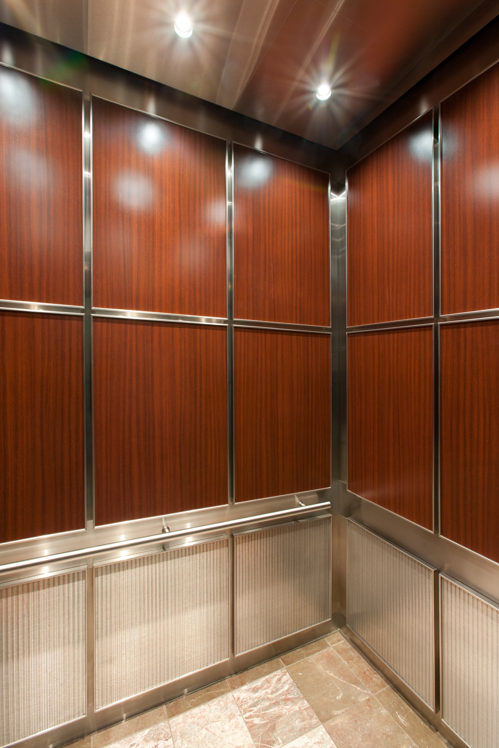 Plastic laminate wall panels are a cost effective way to make your elevator cab interiors really stand out. Plastic laminates come in a plethora of finishes, color selections and even textures. However, plastic laminate tends to chip and scratch easier than other types of material. When plastic laminate wall panels are used on the lower area of an elevator cab, the edges tend to become chipped or cracked do to frequent contact with carts and luggage type items. One solution for this type of issue is to install wall panel binders on our elevator cab panels. Wall panel binders are a metal framed border that surround the edges of each wall panel. These panel binders effectively prevent chipping and cracking that originates from the edges and corners of elevator cab wall panels. The great thing about panel binders is that they look fantastic. Binders come in a variety of metal types and finishes that will match almost any cab design. Check out this link to our portfolio page for a look at an elevator cab interior with a wall panel binder system. ( https://ceii-cab.com/winston-house-washington-dc/ )
