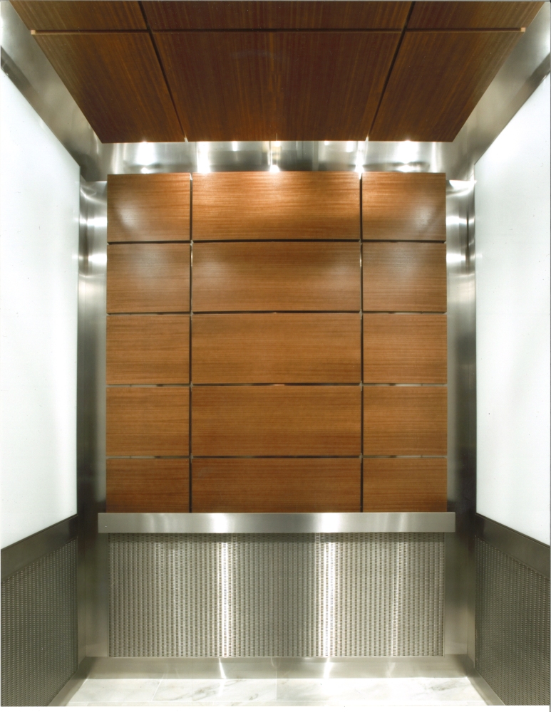 Fairview Park elevator cab interiors feature an upscale upper/lower wall panel design. Our elevator interior renovation consisted of the installation of new ceiling, lighting, reveals, handrails and wall panels. The island style ceiling is a six section ceiling made with wood veneer. Lighting in this cab is recessed, located above of the ceiling. The recessed lighting is attached to the top of the elevator ceiling and reflects light off the cab dome and frieze. This effectively back lights the area above the ceiling as well as illuminating the entire cab cab interior. The upper rear elevator interior wall panels are wood veneer, fashioned in a grid layout which matches the ceiling. The upper side wall panels are white laminated back painted glass. This cab’s lower wall panels are fabricated using architectural woven metal. Both the upper glass panels and the lower woven metal panels are wrapped in a satin stainless steel panel binder. The panel binders offer added protection and support to the wall panels. Reveals and flat bar handrail are fashioned from satin stainless steel. The Fairview Park elevator cab interiors incorporate numerous high end materials resulting in a stylish architectural design.