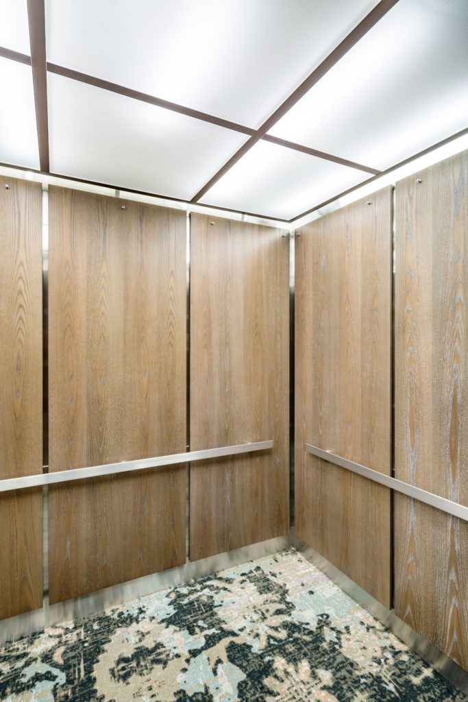 Highline Apartment elevator interior renovation has a vertical wall panel design. The elevator interior wall panels are crafted using wood veneer. The ceiling is a satin aluminum grid with lay-in poly-carbonate twin wall lighting diffusers. LED strip lighting specifically designed for elevator cab interiors is attached to the cab dome. The reveals, base, frieze and handrails are satin stainless steel. The combination of finishes gives this elevator cab interior an modern upscale look and feel.