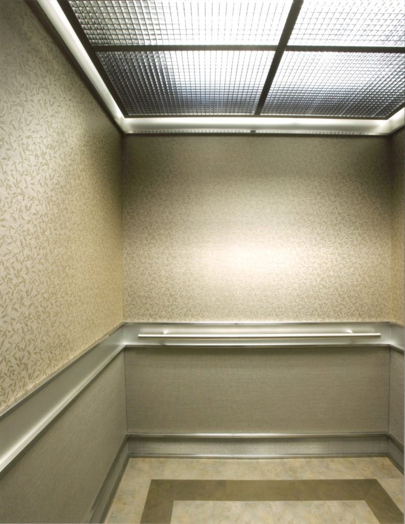 Rossyln Heights elevator interior renovation project was one of a kind. The elevator interior wall panels are wrapped in fabric. Upper wall panel fabric is a ivy pattern while the lower wall panels are a textile pattern fabric. The upper and lower wall panel sections are segregated by a satin stainless steel chair rail. Integrated into the top and bottom the chair rail are mirror polished ribs that run horizontally throughout the elevator cab interior. The frieze and base match the chair rail design. This elevator ceiling is a satin aluminum grid frame with lay-in egg crate light diffuser panels. Lighting used in this elevator cab are florescent fixtures attached to the cab dome. The flooring for this cab is a vinyl tile with a double border. This cab design is both elegant and tasteful.