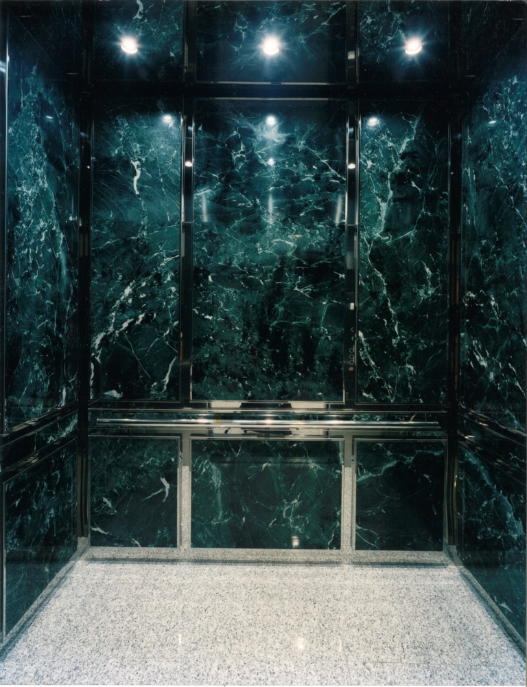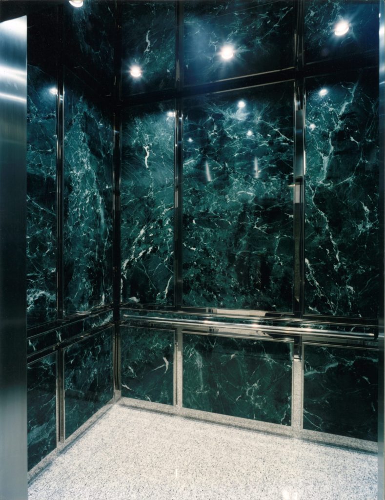 The Shawnee Plaza elevator cab interior project was very unique. The elevator interior wall panels are fabricated from marble and wrapped in mirror polished stainless steel panel binder. The wall panel binders are a necessity when using fragile panel material such as marble. Panel binder protects the panel, helping to prevent cracking or fracturing of the marble. The elevator ceiling was fabricated using mirror polished stainless steel with integrated LED down lighting. Reveals and handrails are fabricated from mirror polished stainless steel. The materials used in this elevator cab interior come together nicely giving it a classic yet classy look.