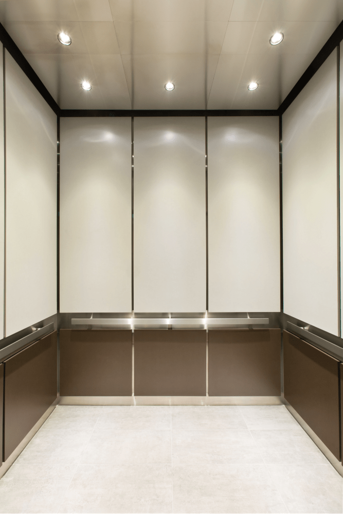 Summit Center is a basic upper/lower wall panel elevator cab design. The wall panels are selections of plastic laminate. Reveals and handrail are satin stainless steel. The island style ceiling has integrated LED down lighting. Cab lighting is specifically designed to properly illuminate elevator cabs based on the cab’s square footage. This elevator cab interior has a nice look. Its design is well suited of a business or residential type of building.