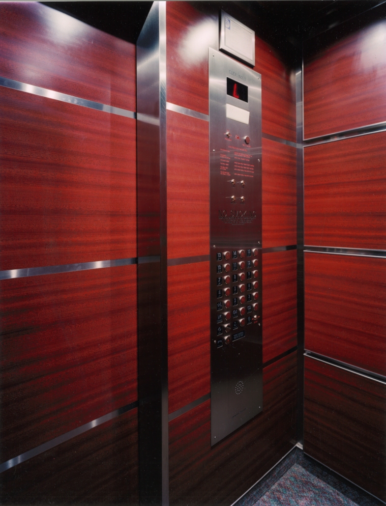 The Seasons elevator cab interior implements a horizontal panel layout to its design. The ceiling is mirror polished stainless steel with LED down lighting. Cab lighting was specifically designed to properly light this size elevator cab. The elevator interior wall panels are a wood grain plastic laminate and wrapped in satin stainless steel panel binders. Panel binders provide a high class look as well as providing increased protection the wall panel edges. The reveals are satin stainless steel and match the panel binders. This elevator cab front wall is unique with respect to the satin stainless steel reveal strips. These stainless strips are inlayed into the front wall giving the appearance of the horizontal reveals transitioning across the front wall and cab door. The plastic laminate and stainless steel strips are directly applied to the cab front wall and interior door.