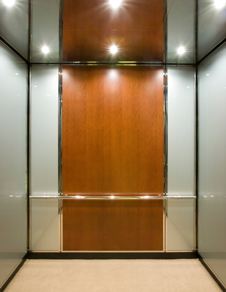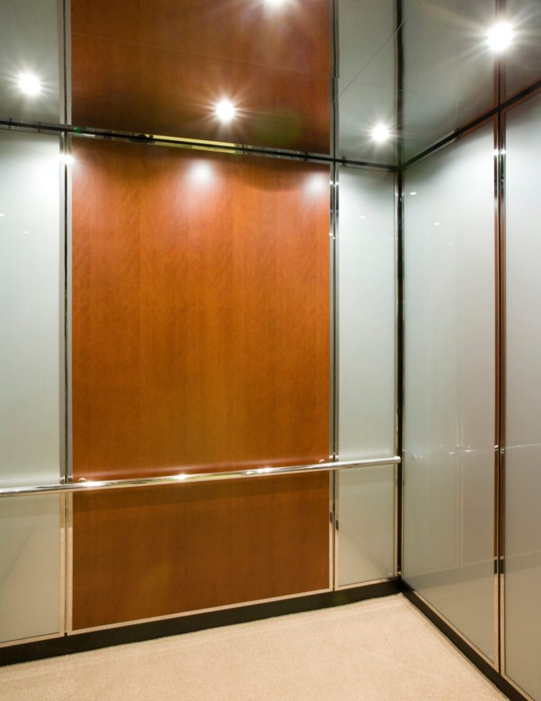 The Watergate Building elevator interior renovation project is an upscale Corner Wall Panel layout. The island style ceiling is mirror polished stainless steel with integrated LED down lighting. Lighting is specifically designed to fit the lighting needs of each elevator on a per cab basis. Elevator interior wall panels are laminated back painted glass with #8 mirror polished stainless steel panel binders. Panel binders look aesthetically pleasing as well as add increased protection to the wall panel edges. The main wall panel is cherry wood veneer wrapped in mirror polished stainless steel panel binders. The rounded mirror polished stainless steel handrail goes well with the other stainless steel accents in the cab. This elevator cab interior is aesthetically pleasing. It has a sharp look with a business oriented feel.